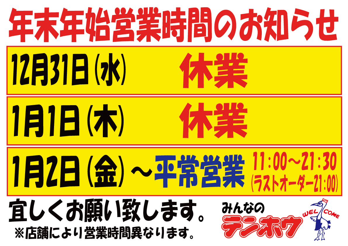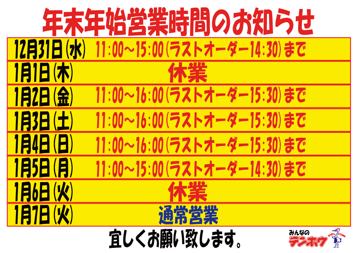 年末年始、営業時間のご案内です。